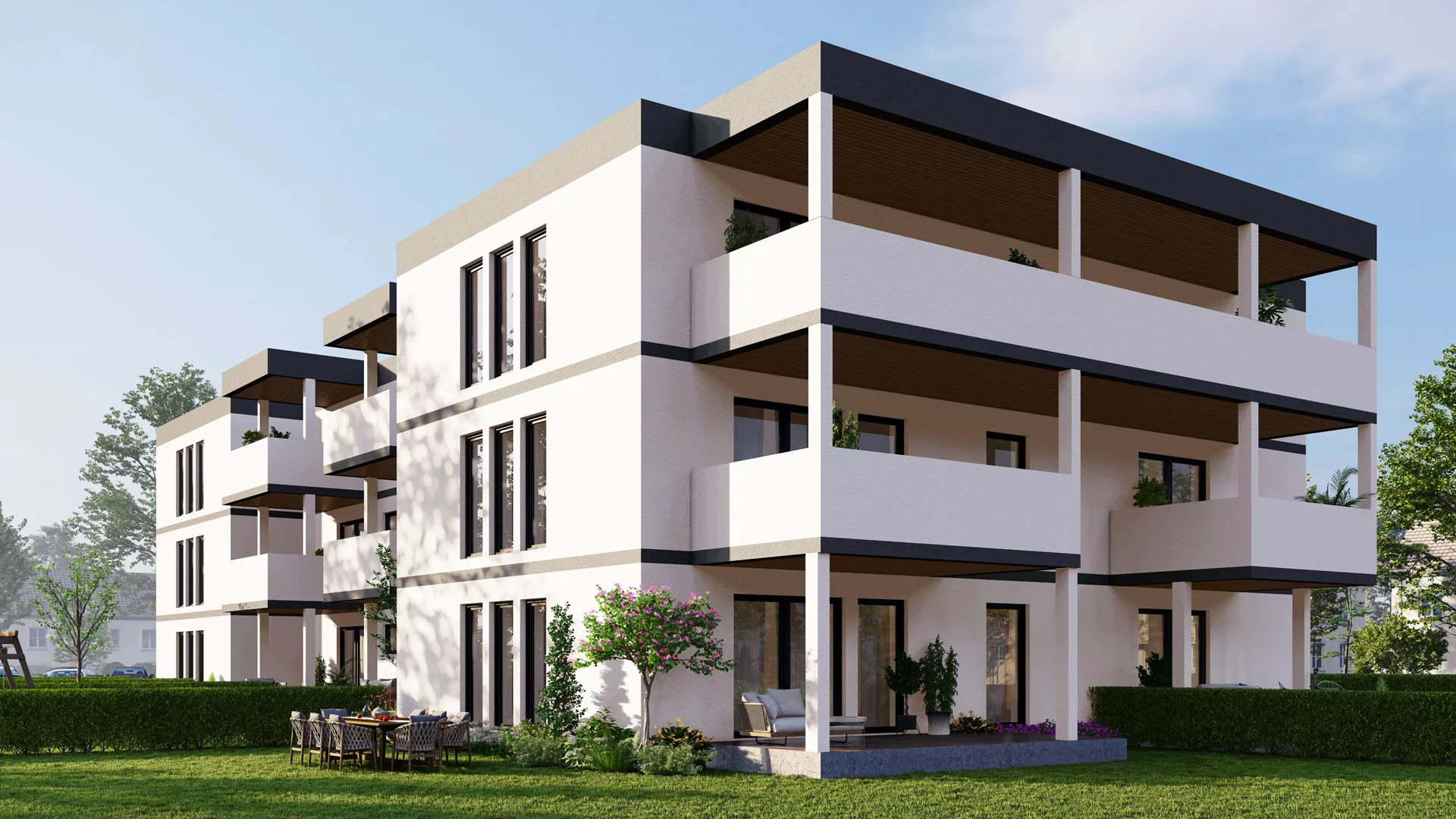 Die Architektur setzt auf klare Linien, großzügige Fensterfronten und helle Materialien, um ein Gefühl von Weite und Leichtigkeit zu schaffen. Jede Wohnung verfügt über eine private Freifläche – ob Garten, Balkon oder Terrasse – und ist so konzipiert, dass Licht und Landschaft Teil des Wohnraums werden. Barrierefreiheit und ein Aufzug in jedem Gebäude sorgen für höchsten Komfort und zukunftssicheres Wohnen.