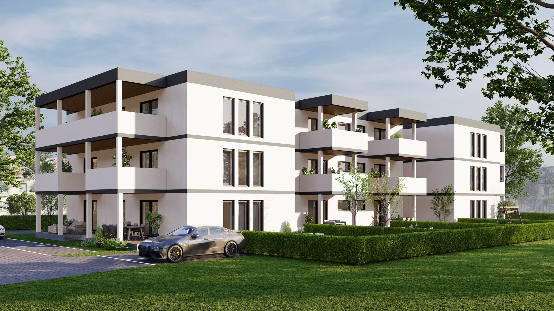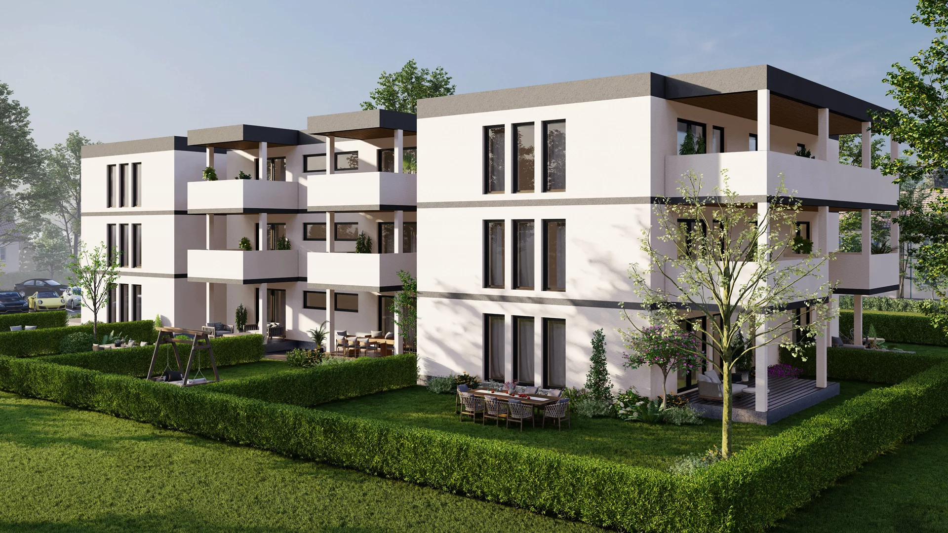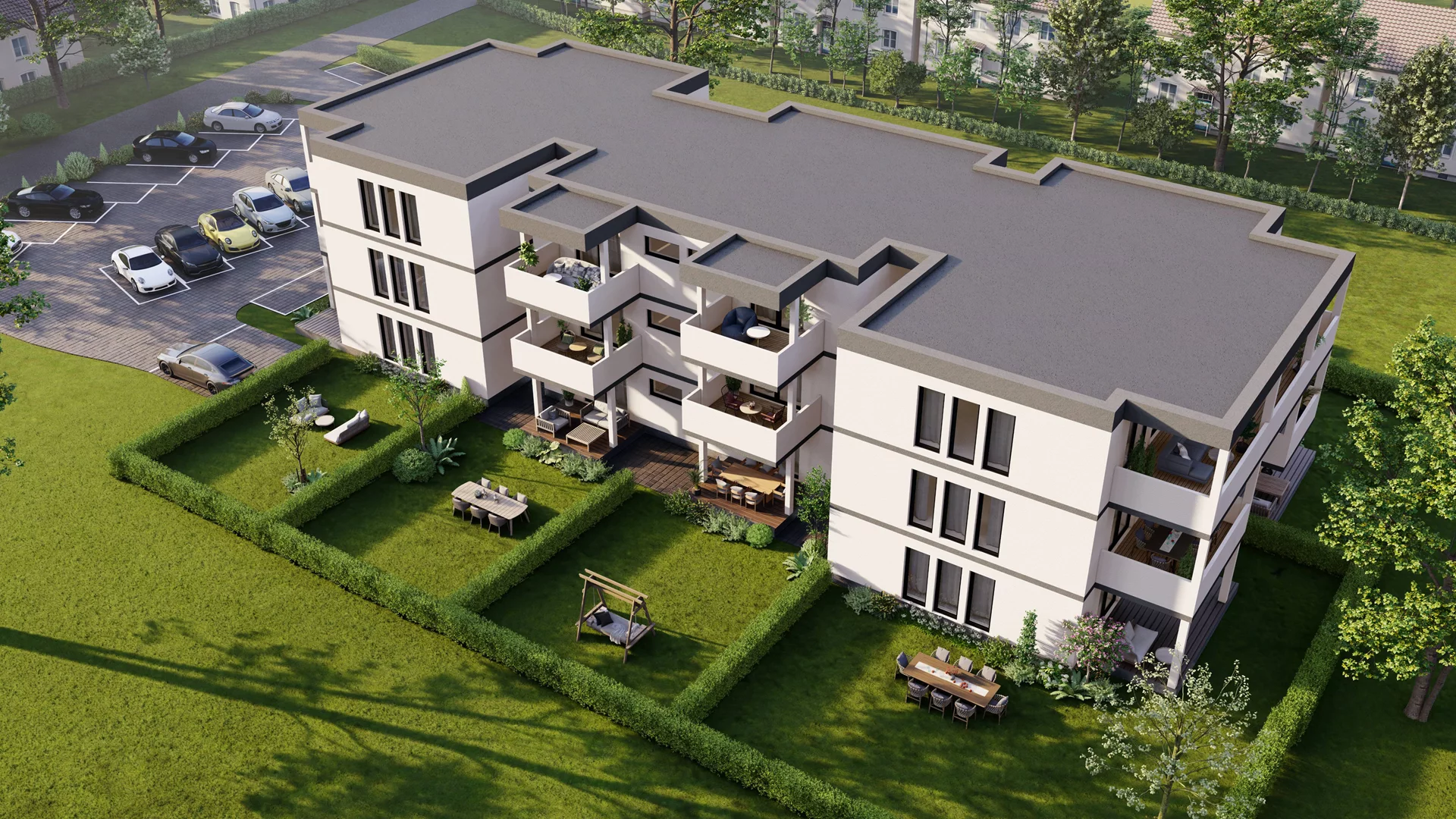 Die Architektur setzt auf klare Linien, großzügige Fensterfronten und helle Materialien, um ein Gefühl von Weite und Leichtigkeit zu schaffen. Jede Wohnung verfügt über eine private Freifläche – ob Garten, Balkon oder Terrasse – und ist so konzipiert, dass Licht und Landschaft Teil des Wohnraums werden. Barrierefreiheit und ein Aufzug in jedem Gebäude sorgen für höchsten Komfort und zukunftssicheres Wohnen.